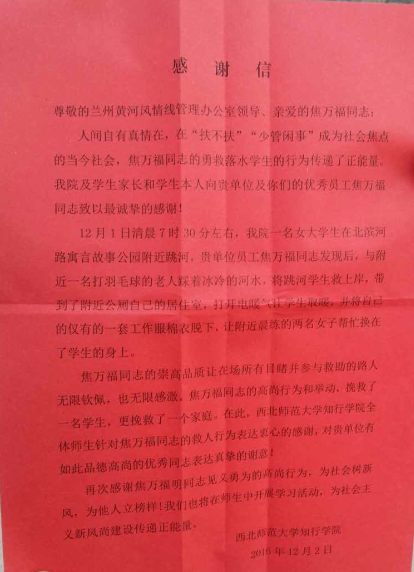 蘭州女大學(xué)生跳河輕生 城關(guān)物業(yè)保潔員冒險及時救人