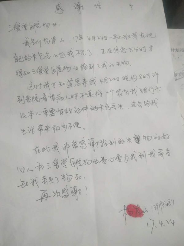 據(jù)悉,韓光華發(fā)現(xiàn)錢包后,在沒有監(jiān)控設(shè)備、沒有其他人員在場的情況下,選擇了第一時間上交,沒有想到據(jù)為己有,這是多么的難能可貴。別人問他是怎么想的,他說:“換位思考一下,如果我丟了錢包,肯定很著急,而且這里面這么多證件和銀行卡,所以第一時間上交給經(jīng)理,希望盡快找到失主。”話語質(zhì)樸,令人起敬。