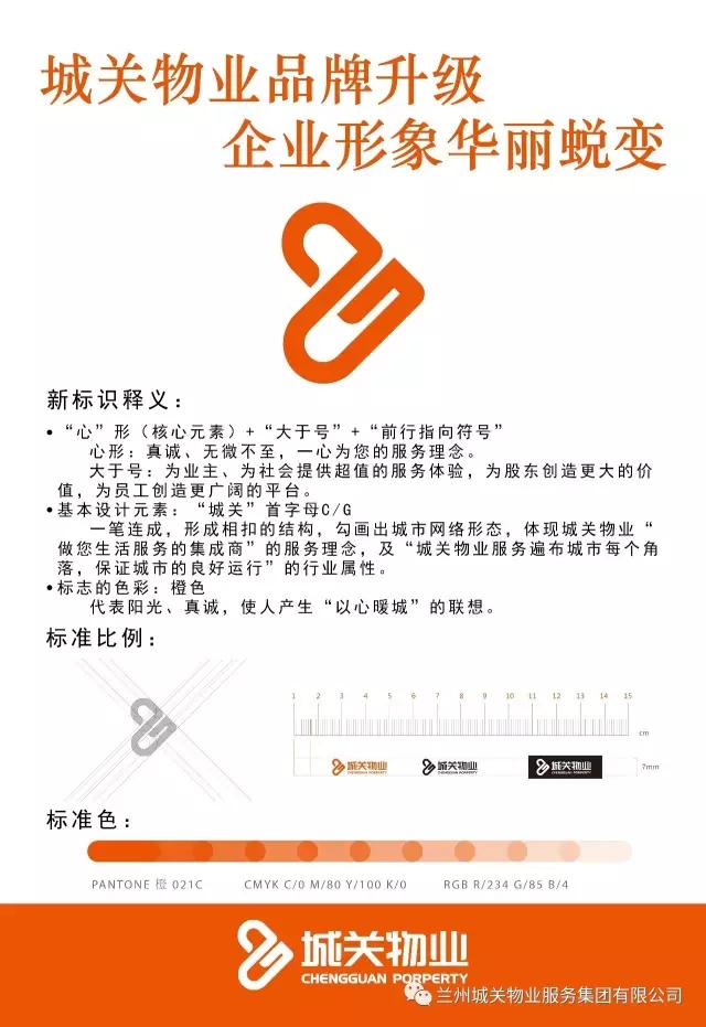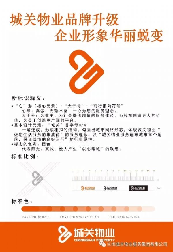 標(biāo)識(shí)是企業(yè)品牌使用頻率最高的視覺符號(hào),是形成品牌視覺形象的核心元素,還是品牌形象的象征與精神體現(xiàn)。城關(guān)物業(yè)服務(wù)集團(tuán)新企業(yè)標(biāo)識(shí)采用了橙色,代表陽光、真誠(chéng),使人產(chǎn)生“以心暖城”的聯(lián)想。并將心形、大于號(hào)、前行指向符號(hào)作為核心設(shè)計(jì)元素集于一體。
