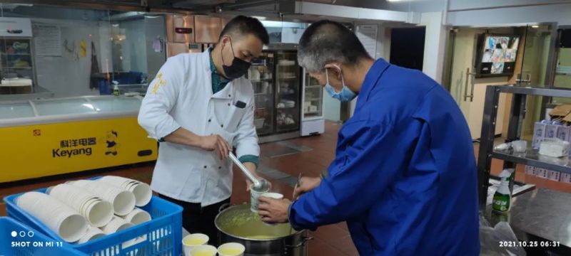 為了確保餐飲能夠及時(shí)送達(dá)各防疫點(diǎn),城關(guān)物業(yè)董事長(zhǎng)楊民召從早上5:30開(kāi)始就帶領(lǐng)大家在配餐間忙碌起來(lái)。他一邊配餐,一邊不停地看時(shí)間,只為確保防疫一線的工作人員吃上熱乎可口的飯菜。他說(shuō)到,“我們的愛(ài)心餐要一直送下去,絕對(duì)不能讓辛苦在防疫一線的工作人員在吃飯上有后顧之憂。”