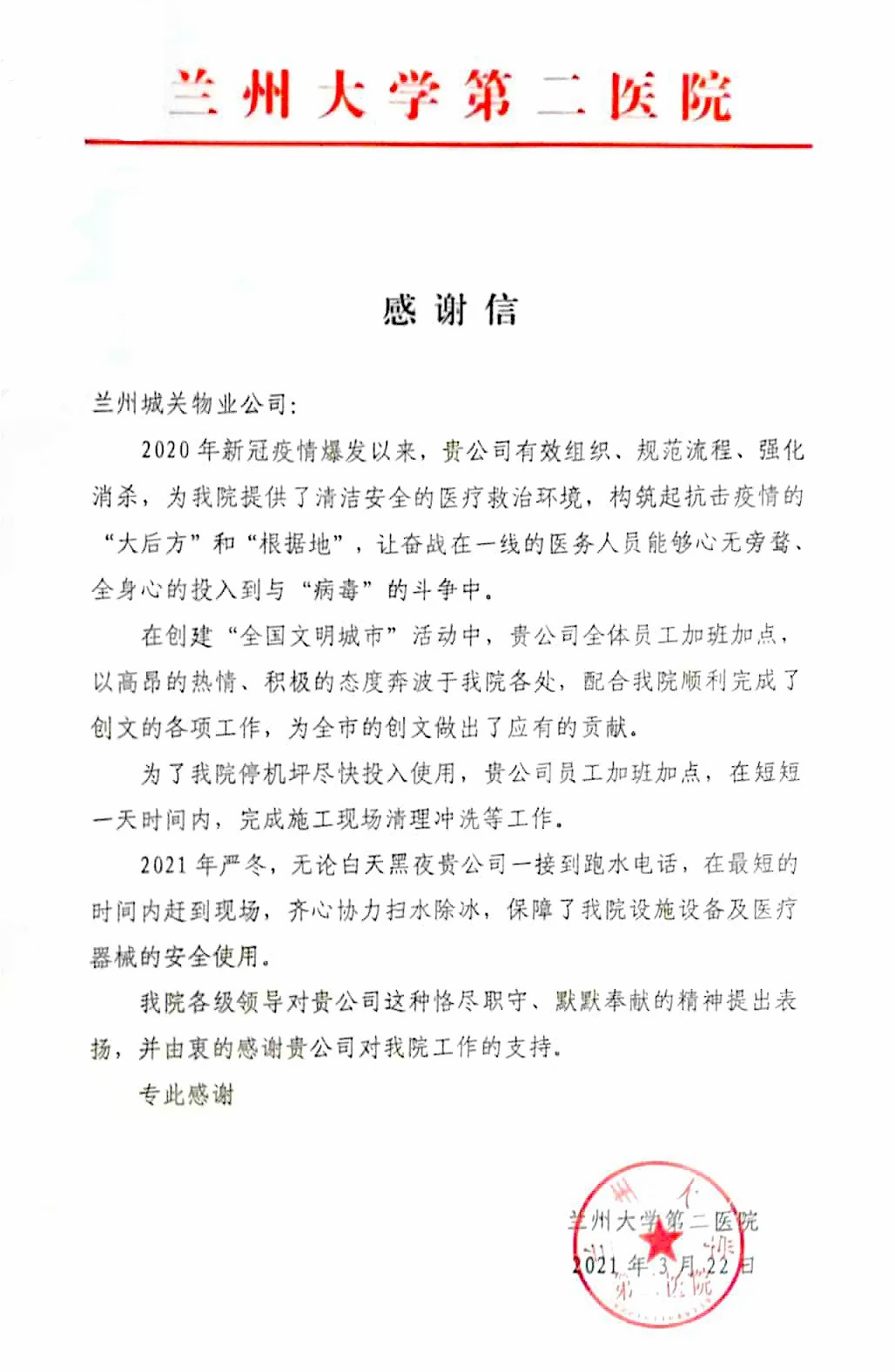 蘭州大學(xué)第二醫(yī)院后勤保障處劉處長(zhǎng)一行人專程來(lái)到蘭州城關(guān)物業(yè)服務(wù)集團(tuán)有限公司,將一面寫(xiě)有“物業(yè)好管家 業(yè)主貼心人”的錦旗贈(zèng)予蘭州城關(guān)物業(yè)服務(wù)集團(tuán)有限公司總裁楊佳林手中,以此表達(dá)對(duì)于城關(guān)物業(yè)的感謝和認(rèn)可。劉處長(zhǎng)表示,2020年新冠疫情爆發(fā)以來(lái),城關(guān)物業(yè)有效組織,規(guī)范流程,為醫(yī)院提供了清潔、安全的醫(yī)療救治環(huán)境,與醫(yī)院一起構(gòu)筑起抗擊疫情的“根據(jù)地”。城關(guān)物業(yè)加班加點(diǎn)保障醫(yī)院后勤的同時(shí),積極配合醫(yī)院順利完成各項(xiàng)創(chuàng)文工作,為蘭州市創(chuàng)建全國(guó)文明城市做出了應(yīng)有的貢獻(xiàn)。